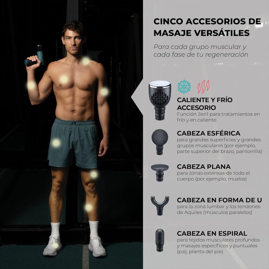 - Cabezal en espiral: Ideal para tejido muscular profundo y masajes puntuales localizados: la planta del pie…